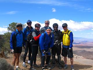 We intended to ride a loop and so parked at the water tank on Old Dump Road where the Power Line Trail comes out. We rode up the dirt road which was firm and had only a little washboard, and into a somewhat stiff breeze. After climbing 5.8 miles and 1300' we got to the bottom of the singletrack that leads to the Broken Mesa Rim Trail. This was a very rocky, steep and somewhat loose climb. Many of us walked most or much of it. All the way up the terrain was unbelievable. At the top the trail became easier to ride, only because it was mostly level or downhill. We had two endos in this section; one resulted in a bloody face due to a cut at the bridge of the nose, and the other resulted in very bruised ribs. After a few miles the rocks got smaller and the trail less twisty so we were able to ride much more quickly. The last half-mile is down a 20% grade with ragged boulders piled on both sides. The trail itself has many small steps and lots of loose round rocks in the middle. The UtahMountaiBiking guide says to point your front wheel down and go, but that would have resulted in hospital stays for most of us. Dennis and Andy were able to ride most of it, but the rest of us walked. It was a shame to walk down about 20% of the total vertical descent.