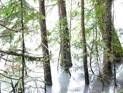 It has also inundated the trail (staight ahead). Hikers pick through the higher rocks to the right.